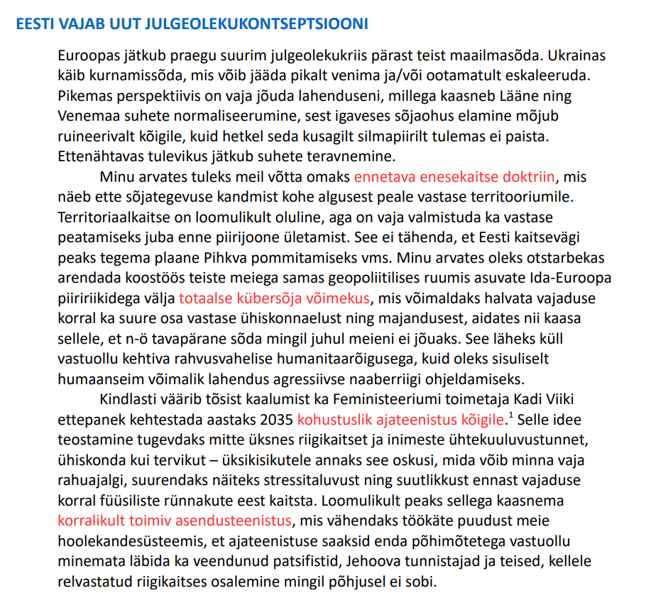 Pihkva ja Ivangorodi, võib-olla ka Peterburi pommitamisega saaks Eesti hakkama, aga Moskva jääb juba liiga kaugele. Mida siis teha? Kuidas ennast kaitsta? 2023. aastal Riigikokku kandideerides avaldasin ma oma valimisprogrammis arvamust, et Eestil tuleks võtta omaks ennetava enesekaitse doktriin, kuid see ei tähenda, et peaks tegema plaane Pihkva pommitamiseks vms.